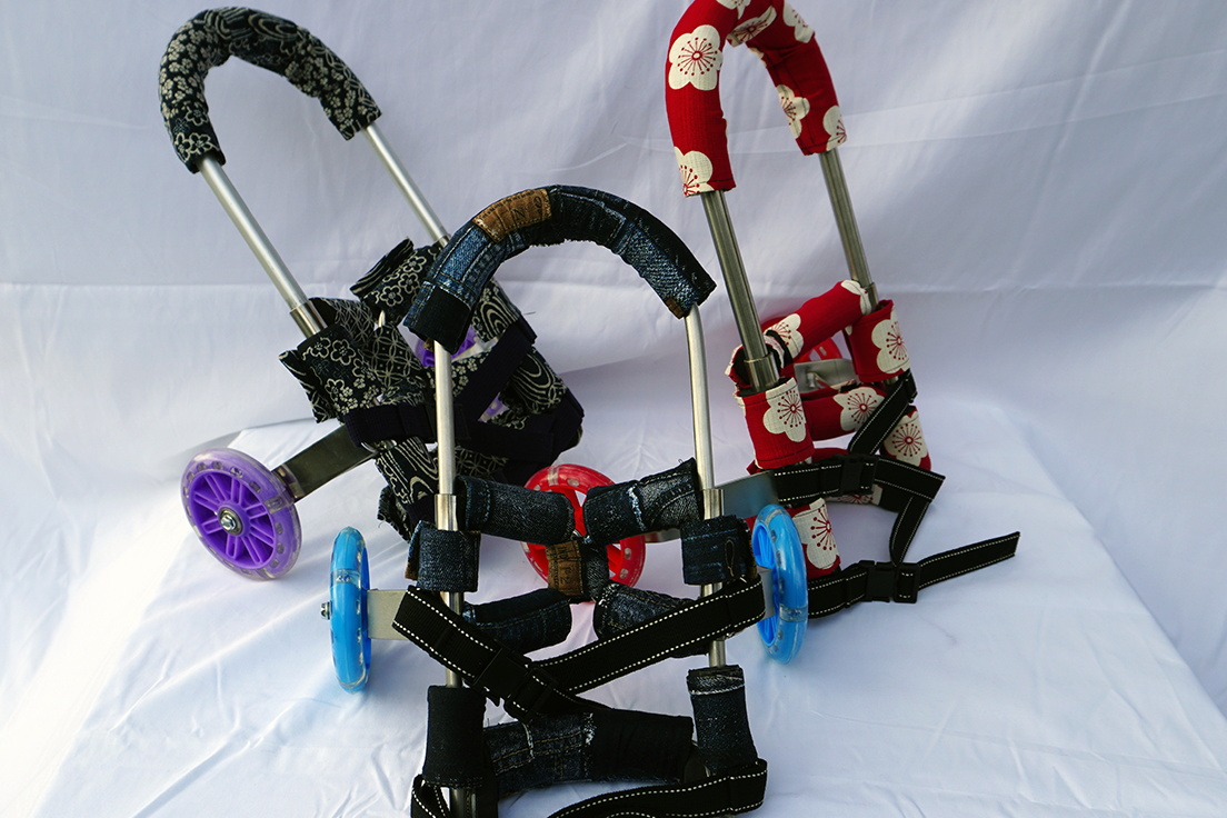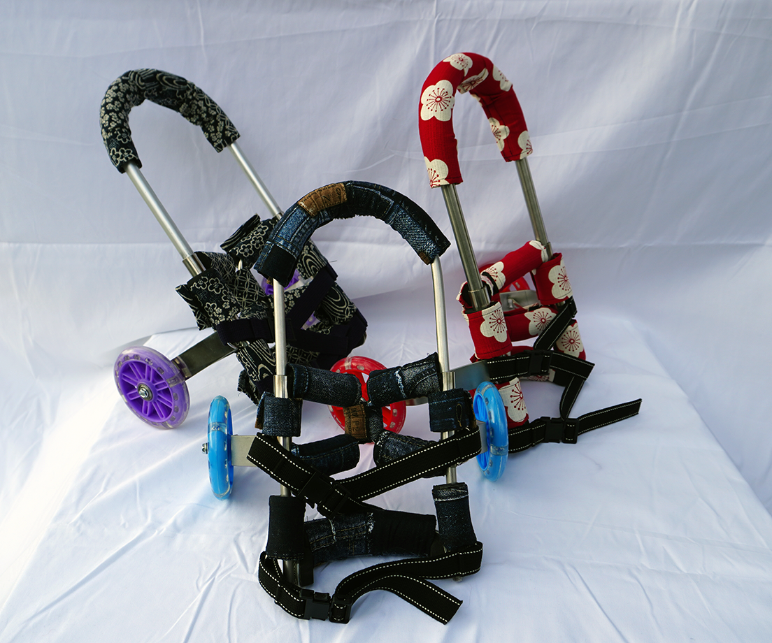 軽くて丈夫で着け心地の良いペット用の車いすを完成させました。